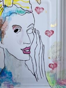 A vibrant, intimate composition on a rectangular plate. The piece depicts a woman gazing directly at the viewer, radiating positivity, openness, and quiet confidence. Layers of pencil, acrylics, watercolors, and subtle reflective gold elements create texture, depth, and movement, giving life to the surface.
